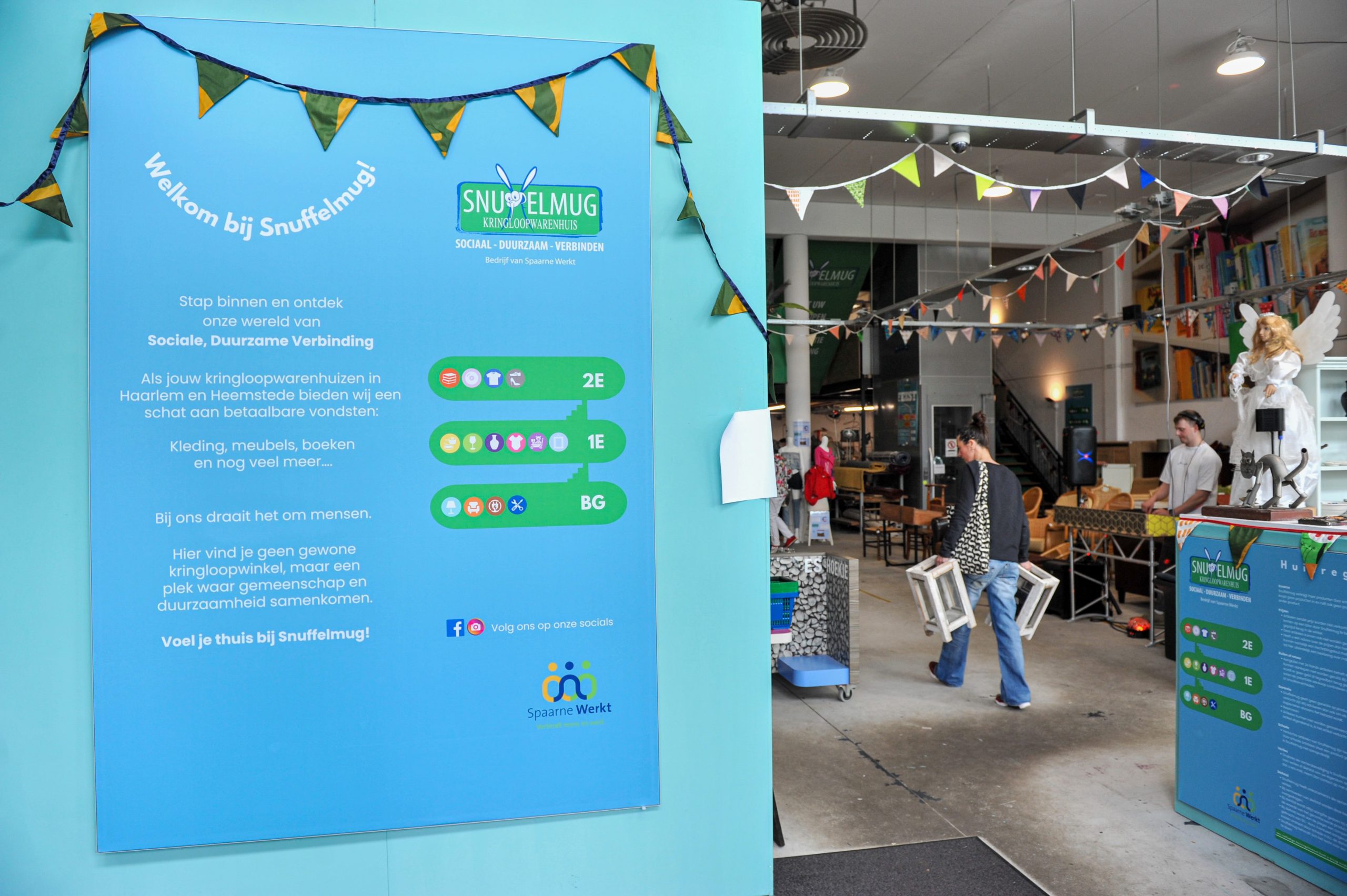 Zaterdag 22 juni was er op beide Snuffelmug locaties feest voor alle bezoekers. Op deze feestelijke dag was er voor ieder wat wils. Bezoekers konden deelnemen aan creatieve workshops zoals ‘Maak een upcycle diadeem’ of ‘Pimp een T-shirt’. Voor de kleintjes waren er leuke kinderactiviteiten, waaronder kinderschminken. Live muziek en entertainment de hele dag door en kon je het circulaire project van leerlingen van het Coornhert Lyceum in Heemstede bewonderen. En alsof dat nog niet genoeg was, boden we ook feestelijke kortingen aan! Het was een dag vol plezier en gezelligheid bij Snuffelmug. Beide evenementen waren een groot succes en boden de perfecte gelegenheid om samen met onze partners, suppoters en gemeenschap feestelijk de toekomst in te gaan. We kijken ernaar uit om samen verder te bouwen aan een wereld van mogelijkheden, duurzaamheid en verbondenheid. Snuffelmug is een bedrijf van Spaarne Werkt met kringloopwarenhuizen in Haarlem en Heemstede, inzamel- en sorteerlocaties in de Waarderpolder en in Bloemendaal en het grote Textielsorteercentrum in Cruquius. Meer informatie op www.snuffelmug.nl.